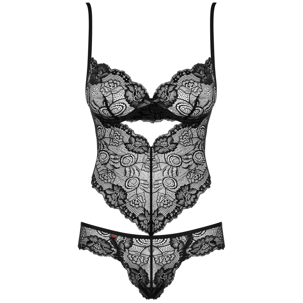 Geef je partner een sexy look van je glorieuze lichaam gewikkeld in deze Alluria-teddy van Obsessive. Het is een verleidelijk kanten setje met een kanten rug, beugelcups en string in één.
