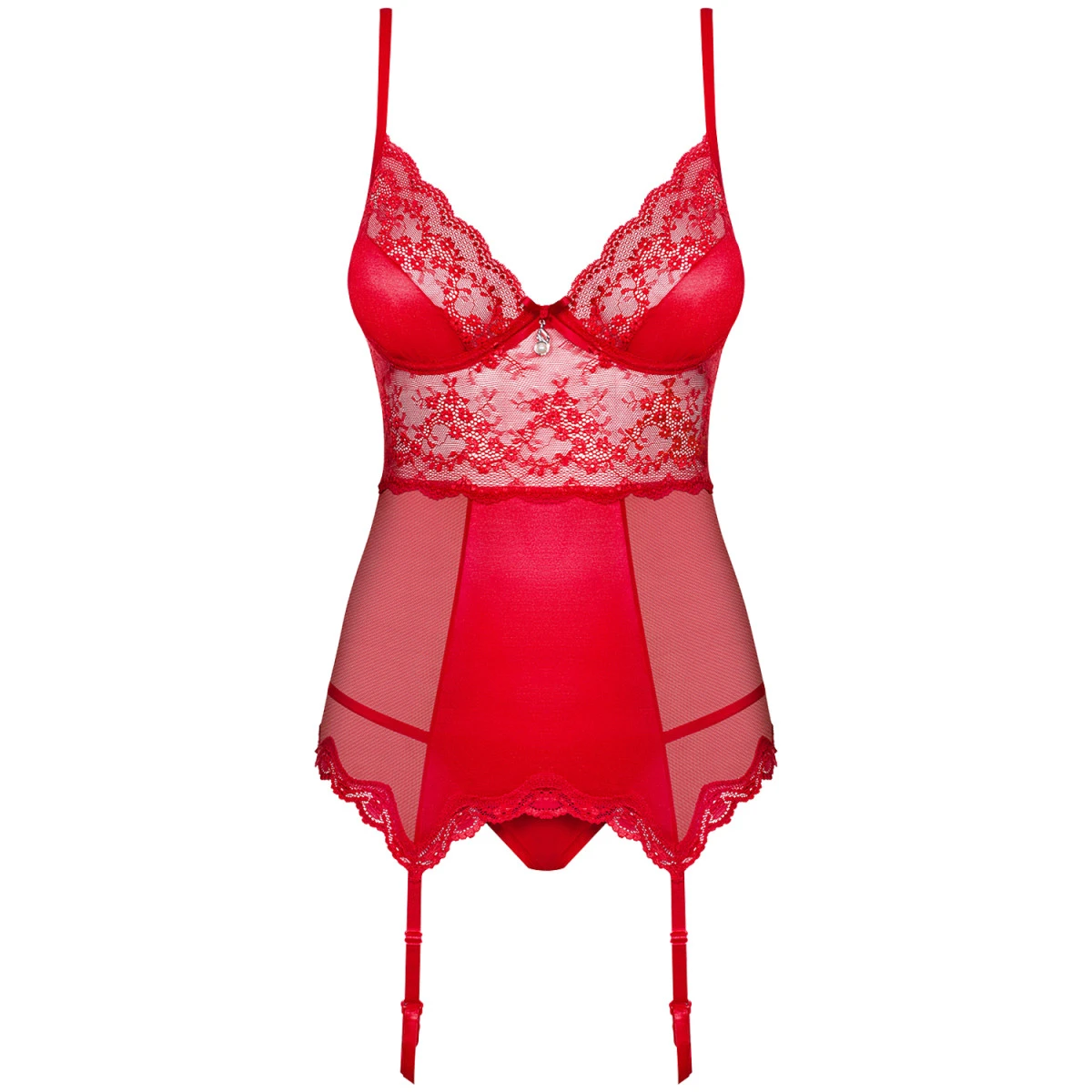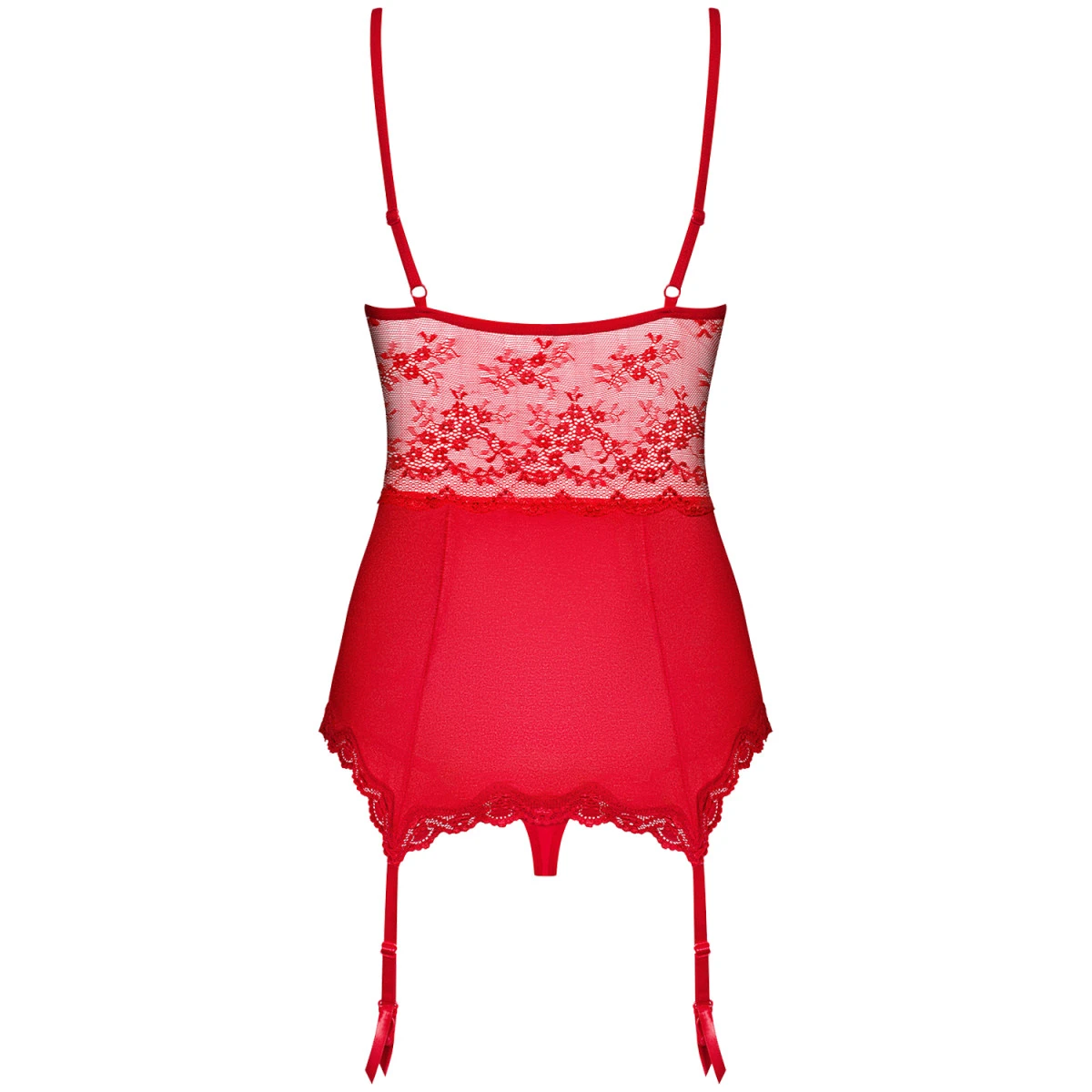 De set bevat een chemise van rood, zacht en licht transparant materiaal waar je discreet doorheen kunt kijken. Het rode kant siert de cups onder de buste en de zoom aan de onderkant, omlijst en benadrukt je mooie billen.