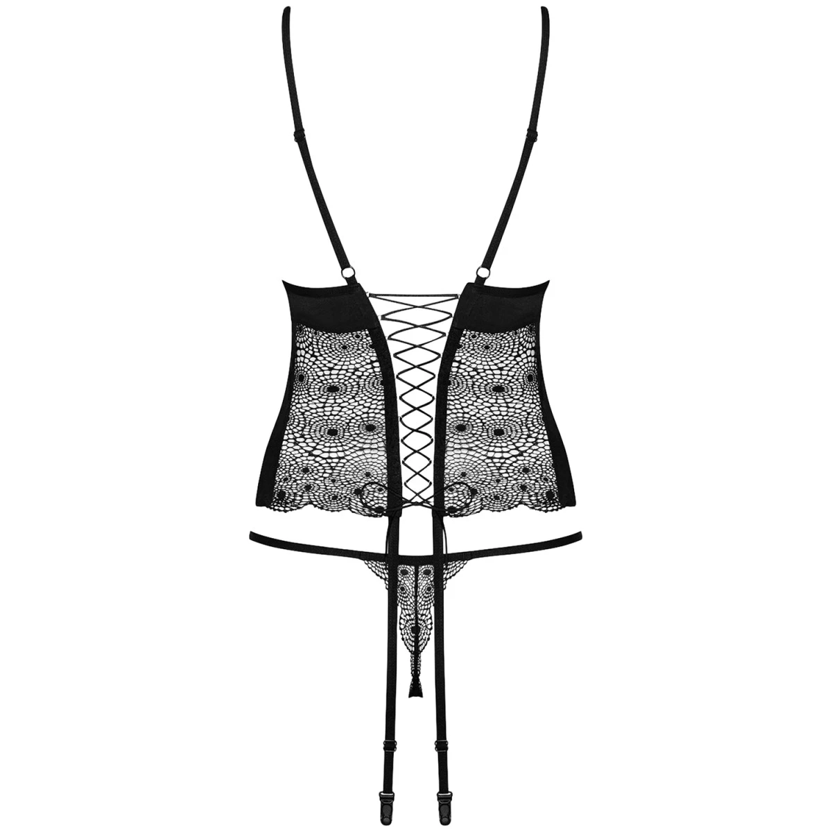 Heers over je slaapkamer en de hongerige ogen van je partner wanneer je de Sharlotte kanten korset set van Obsessive draagt.