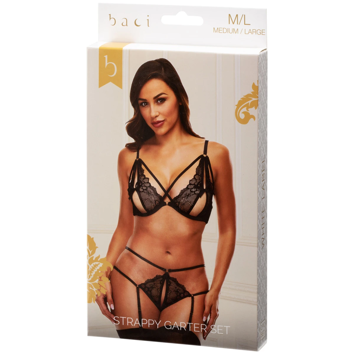 De set bestaat uit een beugelbeha met gedeeltelijk open cups van zwart kant en versierd met satijnen strikjes. Een open split loopt langs beide cups voor een onthullende en verleidelijke look. De omtrek en schouderbanden kunnen naar behoefte worden aangepast.