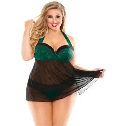 Is dat een boself die we net zagen? Want je ziet er echt magisch uit in deze Fantasy Lingerie Sonia tie babydoll-set. Je borsten worden prachtig omgeven door groene cups met details van bloemenborduursels, terwijl de rest van de jurk sierlijk rond jouw gewelfde figuur vloeit.