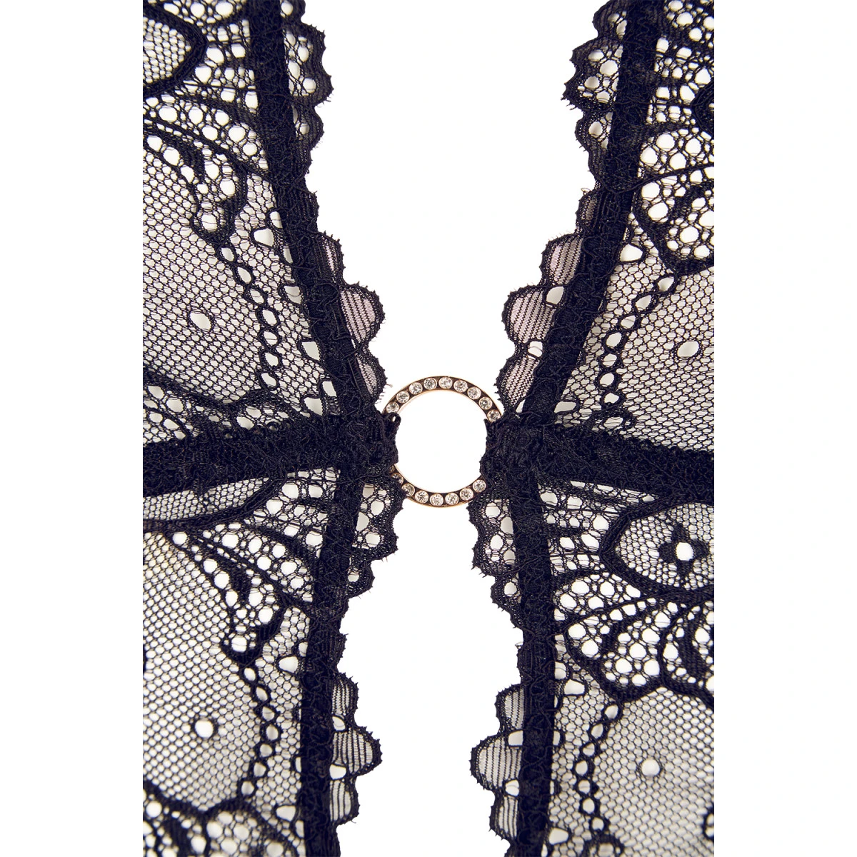 Vier zilveren ringen met imitatiejuwelen verbinden de voorkant, die naar beneden loopt en eindigt in vier jarretelbandjes. De meegeleverde G-string heeft een open kruis voor die gedurfde en gewaagde sensatie.