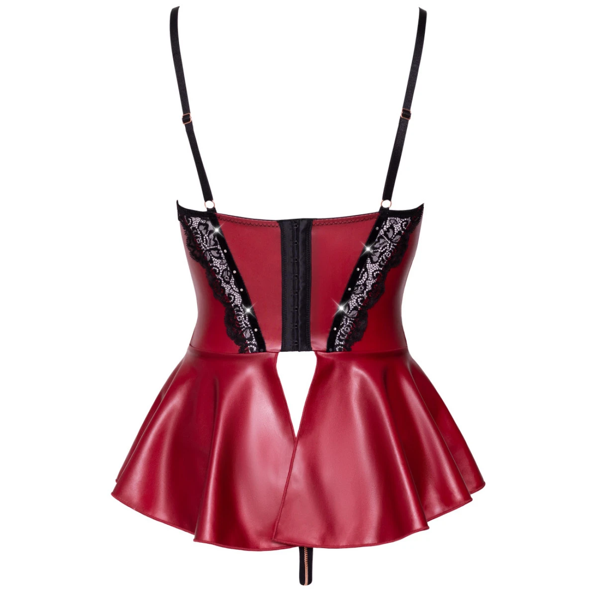 De bustier maak je stevig vast met de haaksluitingen op je rug. De rode, glimmende stof en het doorschijnende kant versmelten in erotische perfectie, waar de strass steentjes een sprankelende touch aan geven. Je borsten worden ondersteund door een lichte vulling in de beugelcups en worden prachtig omlijst met afneembare kettingen.