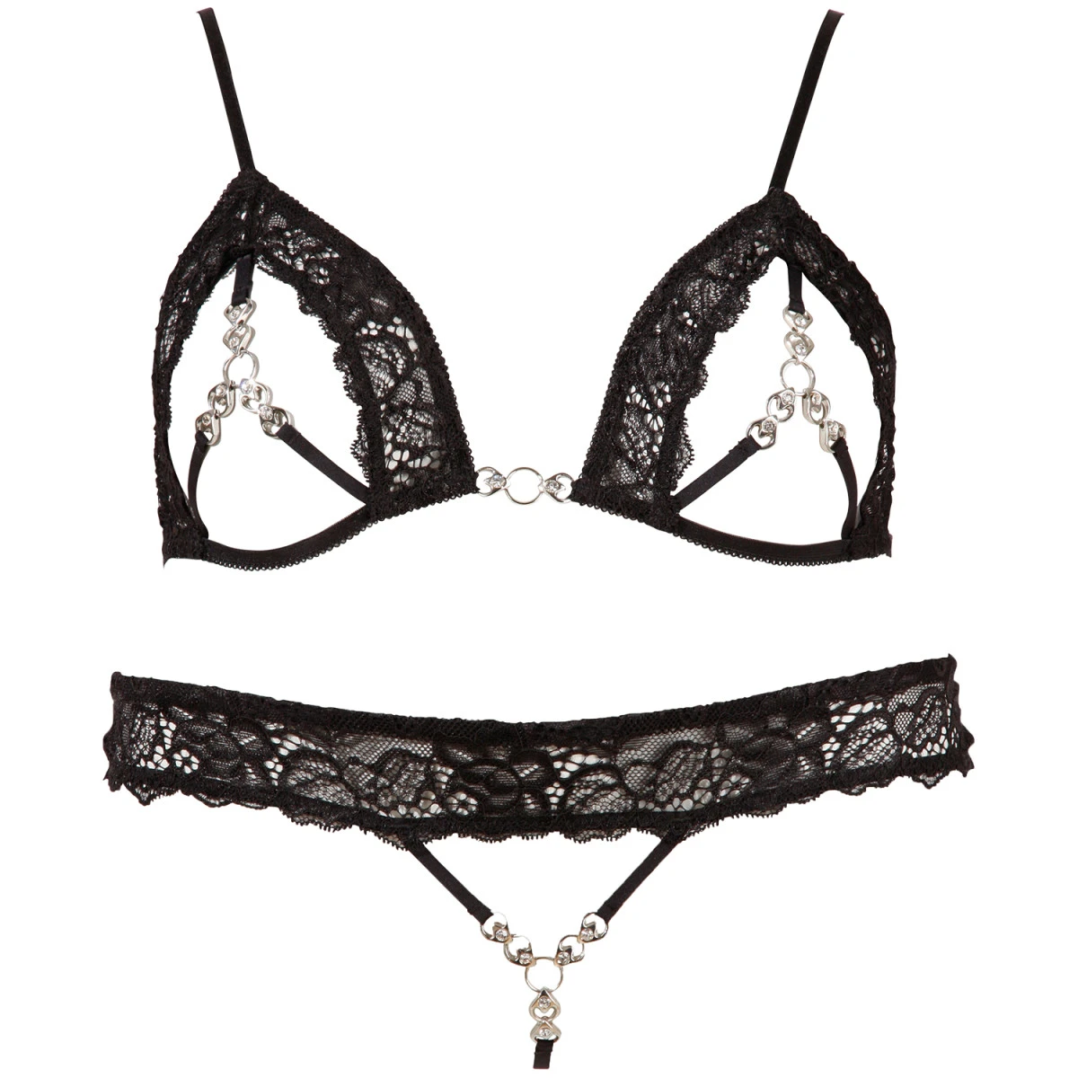 De bh heeft open cups gevormd door een brede rand van zwart kant. Een kleine zilveren ring in het midden van elke cup verbindt drie banden met zes schakels van metaal en strass-steentjes die de tepels bijna bedekken. Beide cups zijn verbonden door een bijpassend sieraad.