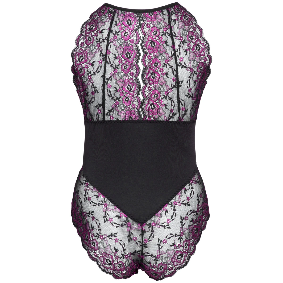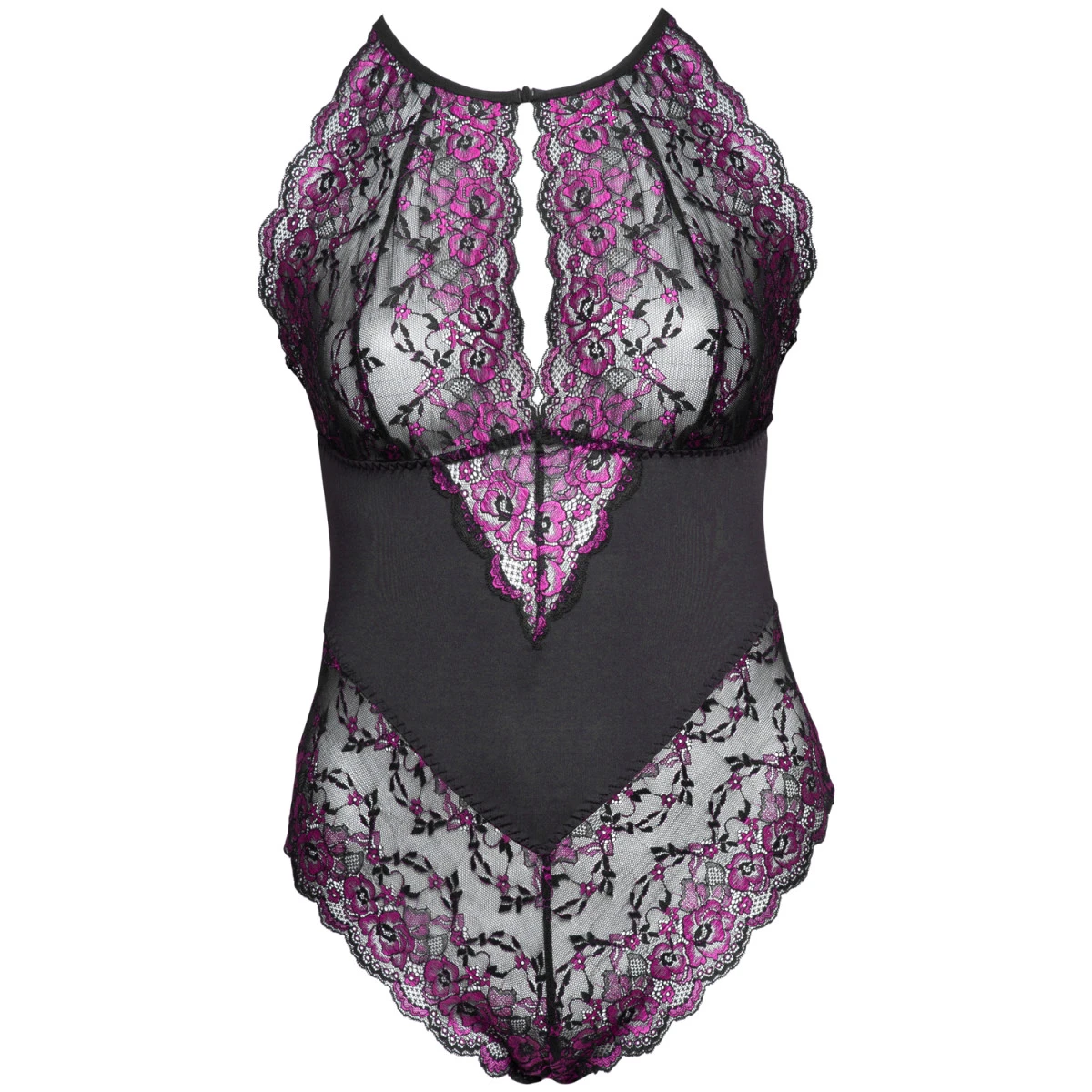 De beugelloze bh en open borst laten je borsten in het middelpunt staan, terwijl de bandjes van de halternek je versieren met kleurrijk kant. Het paars verfraait zowel je borsten als heupen, terwijl je buik daarentegen is bedekt met zachte, satijnachtige stof. Het design accentueert je lichaamsvorm en laat je sexappeal uitstralen.