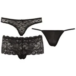 Last but not least bevat het pakket een klassieke mini-string van zacht matzwarte mes met hetzelfde glanzende elastiek voor een uitstekende en uiterst comfortabele pasvorm.