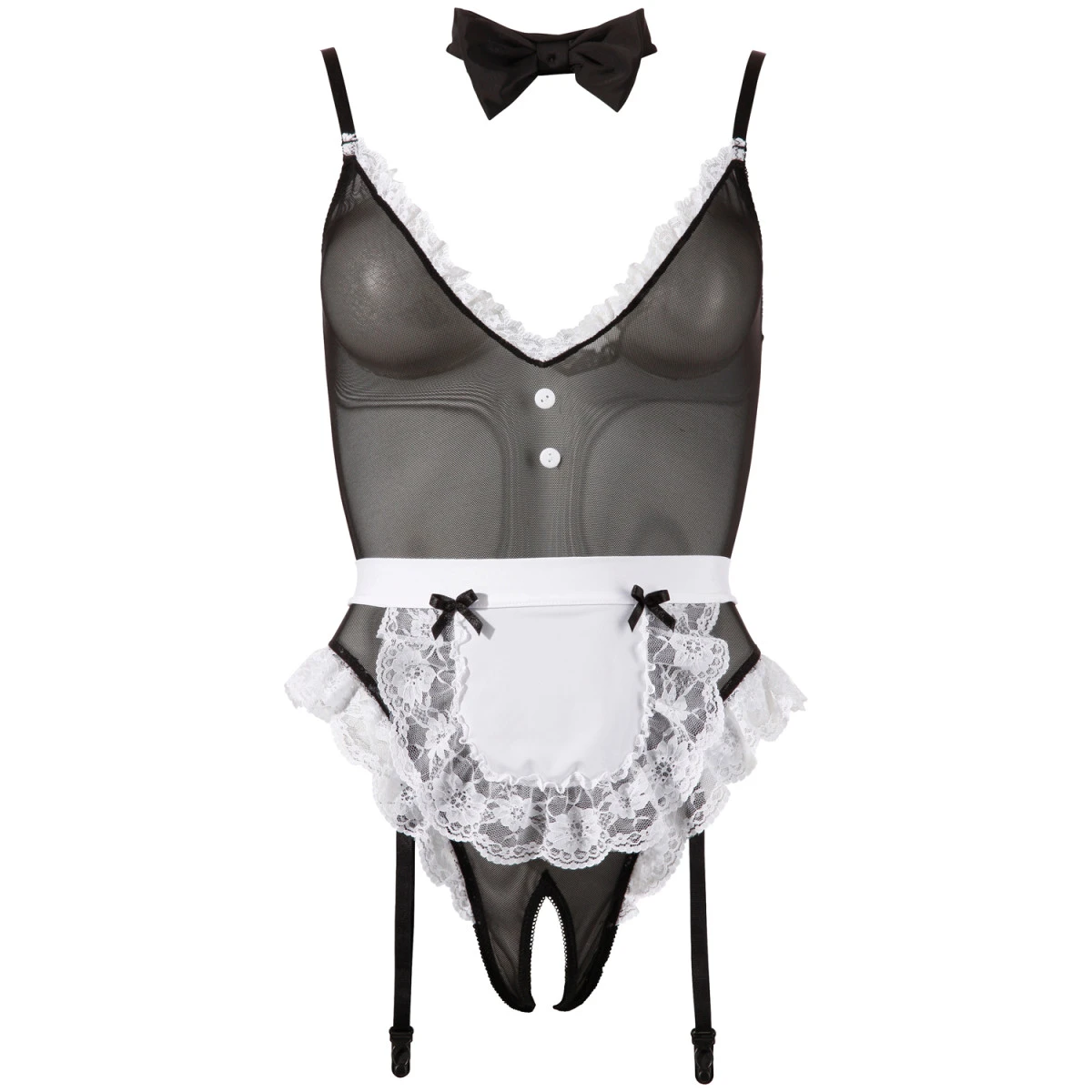 Het kostuum is gemaakt van een zwarte, licht transparante mesh kwaliteit voor een sexy look. Het onderste deel bestaat uit een schort versierd met zwarte satijnen strikken en kant dat mooi contrasteert met de diepe halslijn aan de bovenkant. Een zwart satijnen lint wordt ook meegeleverd en sluit het geheel perfect af.