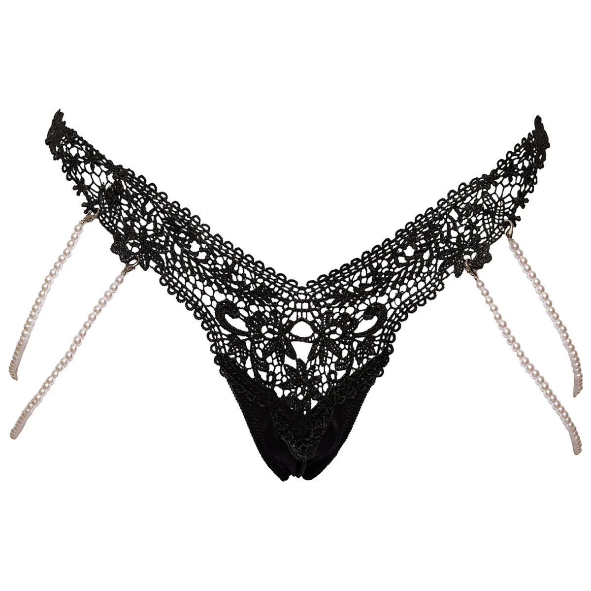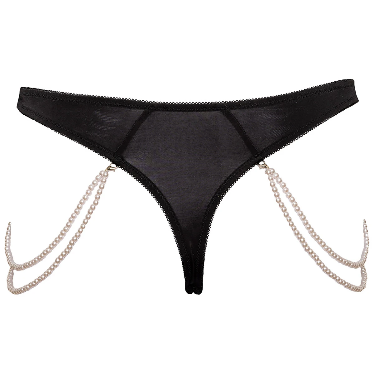Plagend transparante kant aan de voorkant, terwijl de rest van de string gemaakt is van comfortabel stretchy zwart materiaal. Laat de dubbele parelsnoeren op je heupen bungelen voor een speels betoverende look, waarbij de parels meedansen op elke jiggle en jive.