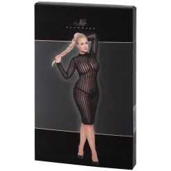 De jurk heeft een strakke pasvorm met een col, lange mouwen en een uitdagend kinky uitsnijding over de buste.