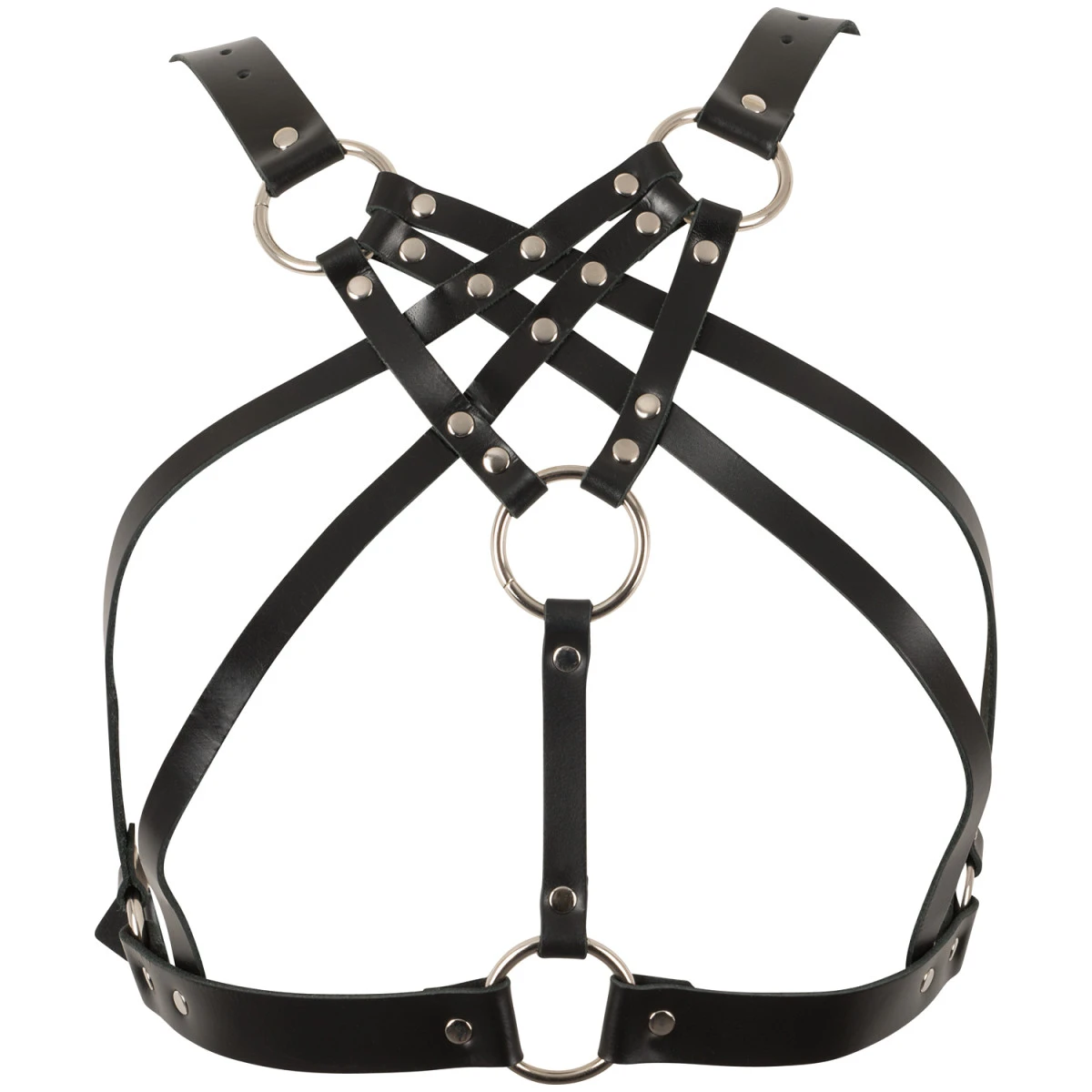 Omlijst de bovenkant van je borst met meerdere bandjes die elkaar kruisen in een decoratief patroon, terwijl langere bandjes over de borsten lopen om met de beha-lijn samen te komen. De bandjes zijn versierd met studs en sluiten op de rug met gespen.