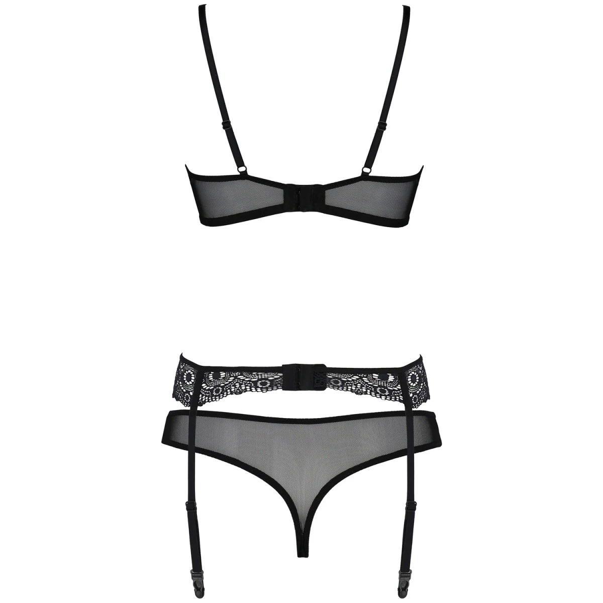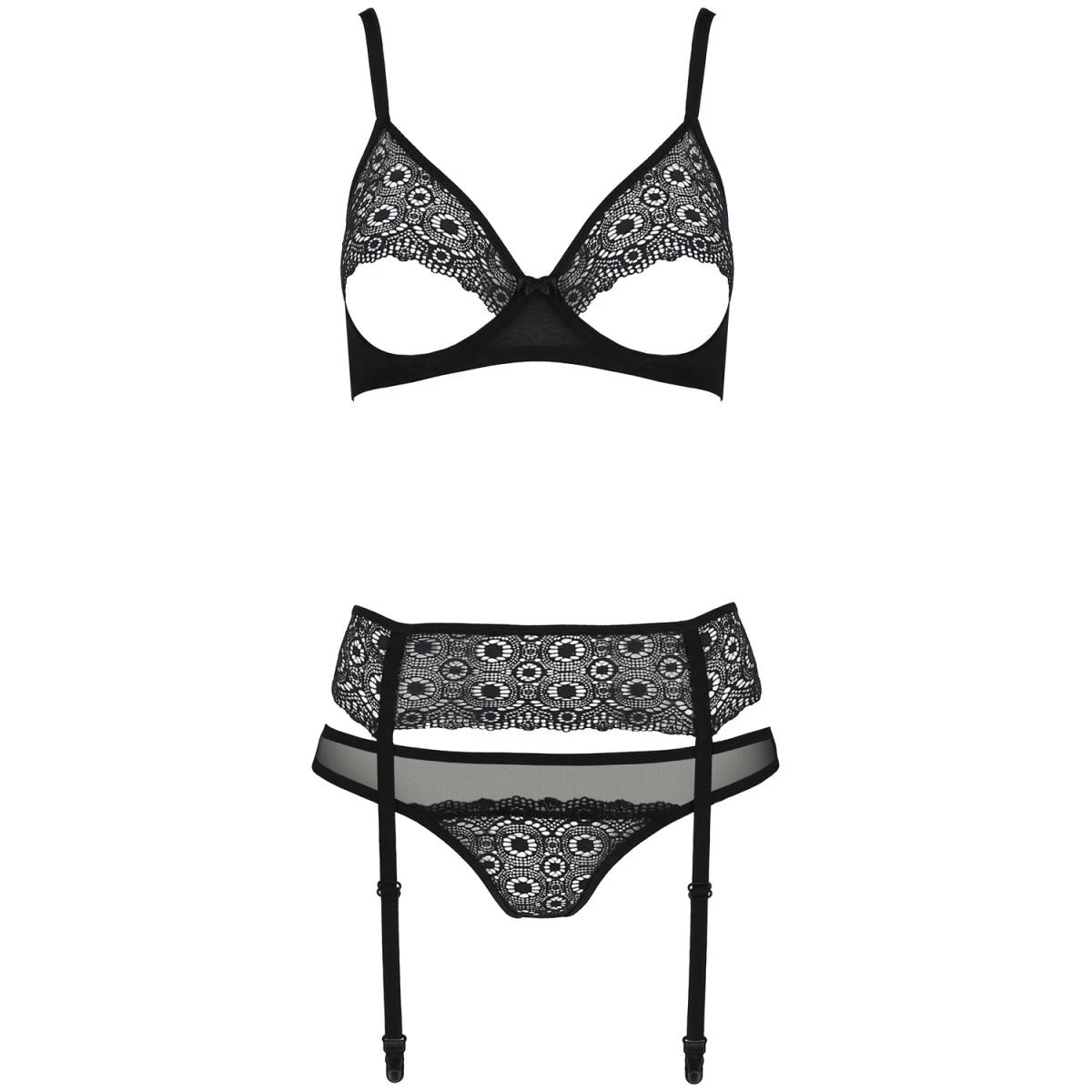 Stap in deze driedelige set van Passion ECO voor en straal pure sexappeal uit. De Zinnia set bestaat uit een semi-cupless bh, een string met open kruis en een jarretelgordel om je look als verleidster van de nacht compleet te maken.