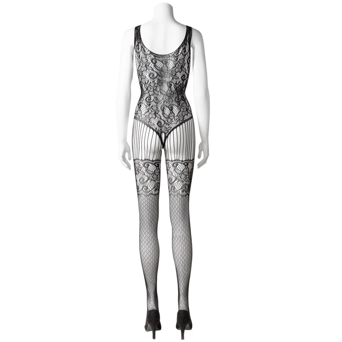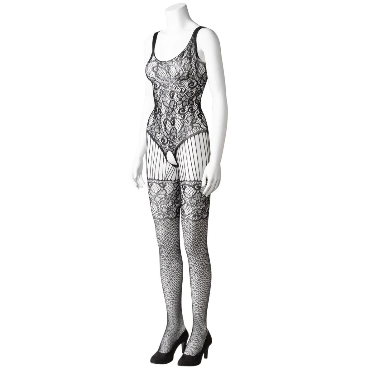 De nauwsluitende catsuit heeft een bovenstuk van vrouwelijk kant dat eindigt in een kinky open kruisstuk, waardoor je vrij toegang hebt tot je intieme zones zodra de temperatuur begint te stijgen.