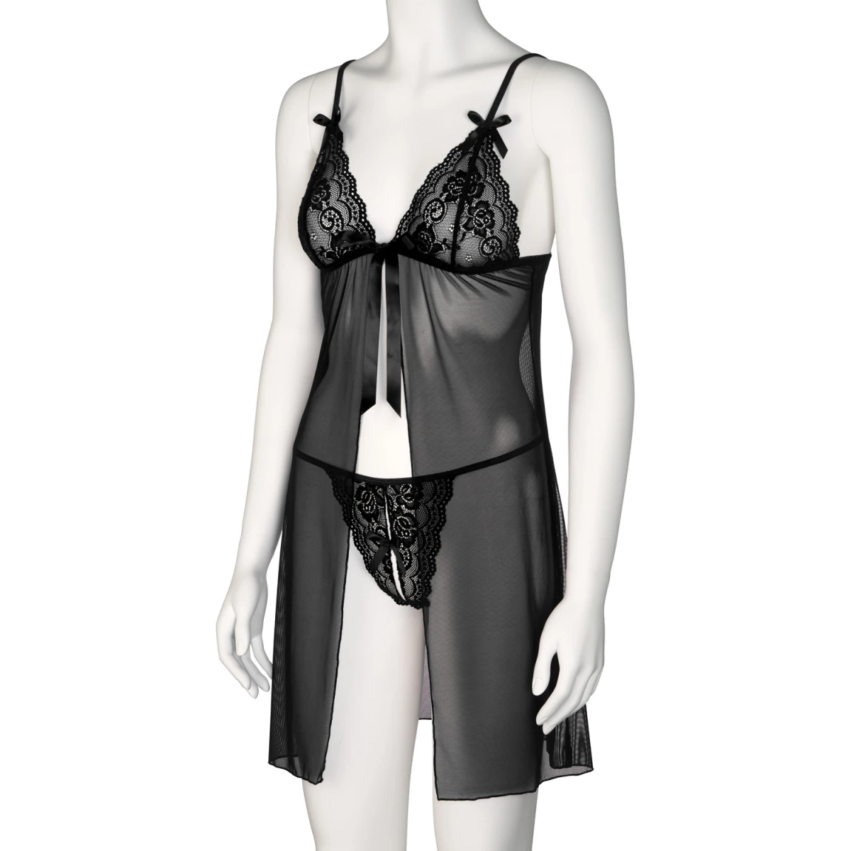De babydoll is licht transparant voor een opwindend “doorkijk” effect. Het sexy kant dat de buste bedekt, draagt bij aan de sensuele look, bekroond door twee eenvoudige bandjes die kunnen worden aangepast voor de perfecte pasvorm.