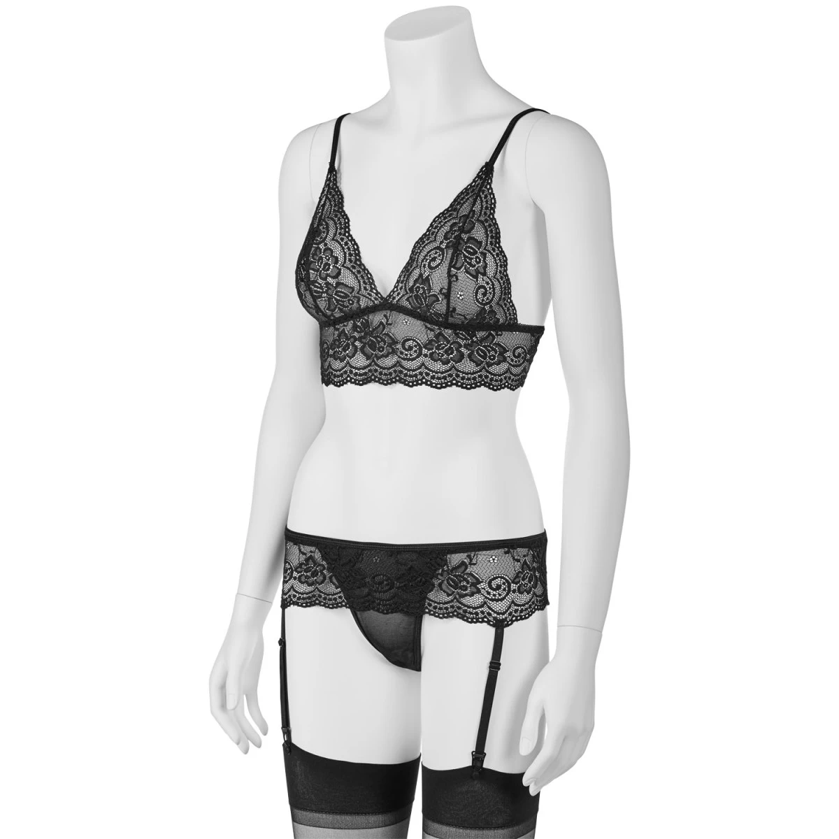 De bijpassende jarretelgordel is gemaakt van hetzelfde brede kant en heeft verstelbare bandjes aan de achterkant. De set wordt gecompleteerd door een semi-transparant G-string slipje.